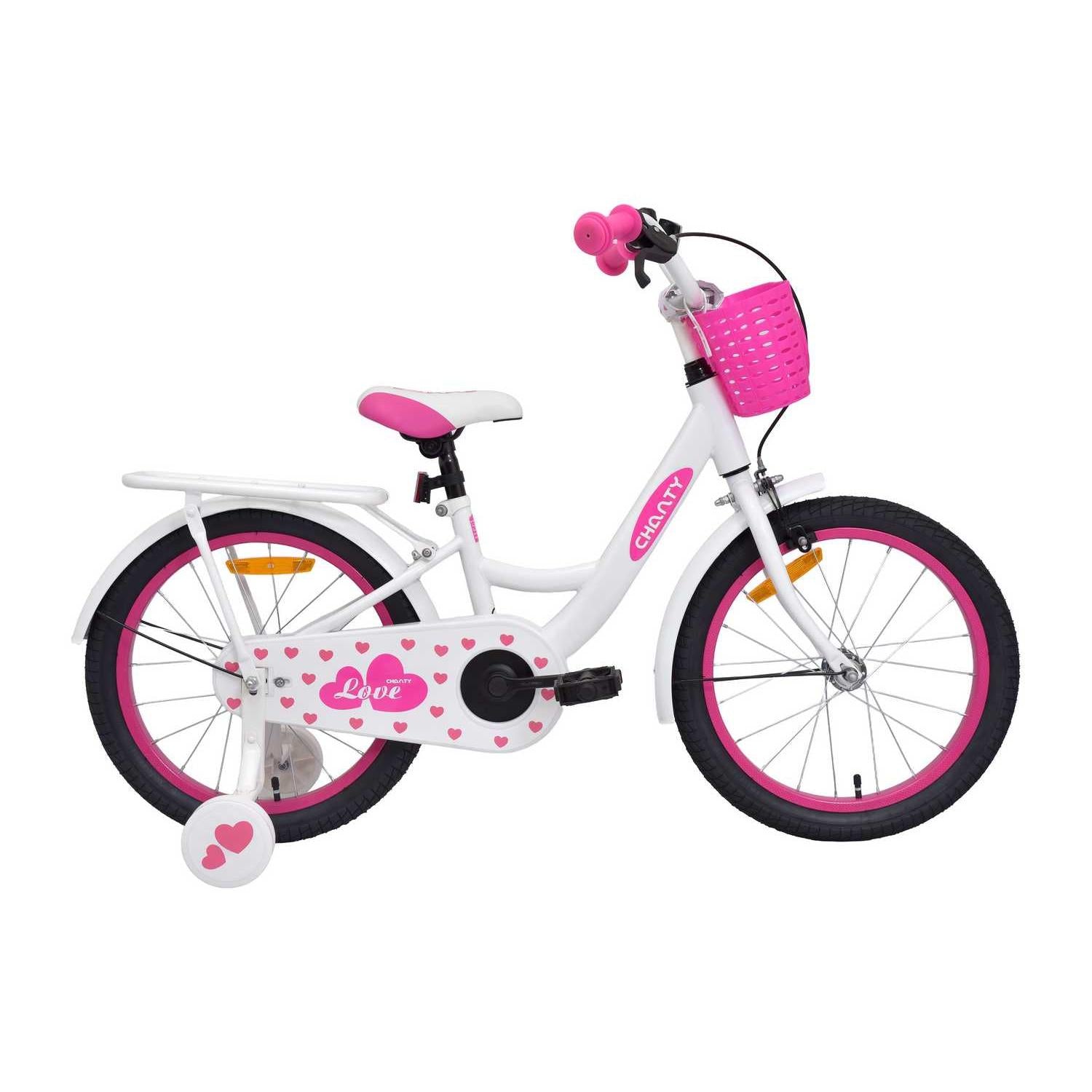 Chanty 18" Love er den perfekte cykel til piger i alderen 5 – 7 år. Med lav indstigning, kurv foran og støtteben kombinerer den tryghed og funktionalitet. Hånd- og fodbremse sikrer sikker kørsel, mens det hvide og pink design giver et sødt og elegant udtryk.