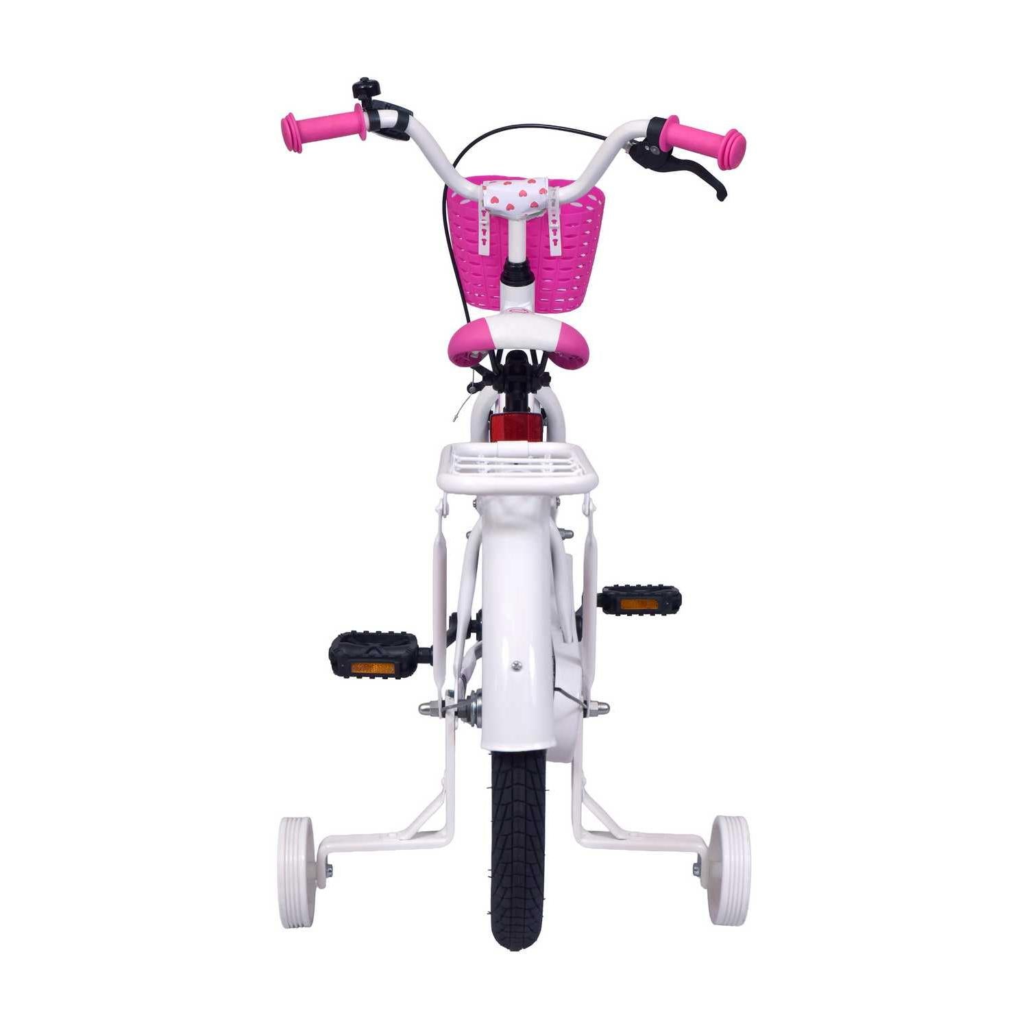 (18" børnecykel i hvid/pink – sødt design og maksimal tryghed til piger.)